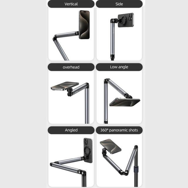 360° full rotation with a dual-direction metal hinge lets you switch between horizontal, vertical, overhead, or panoramic shots without moving the base.