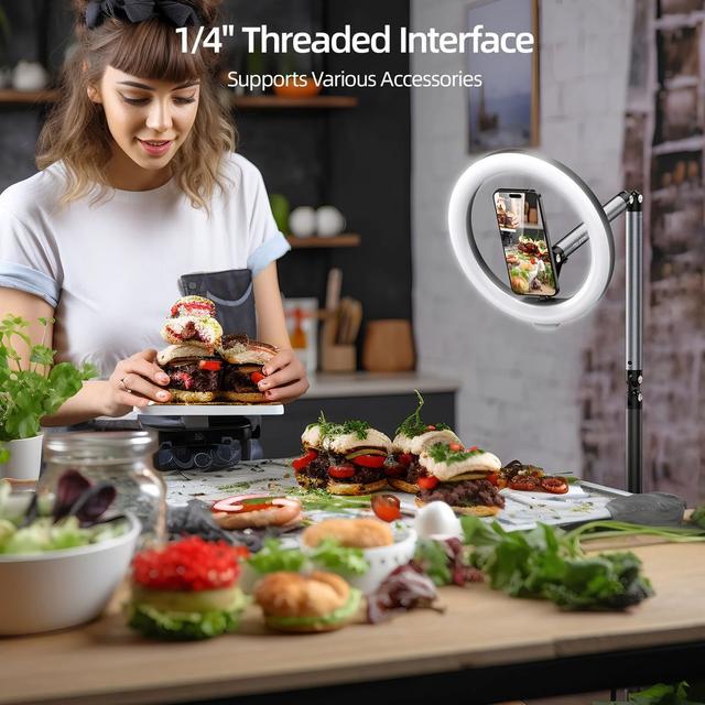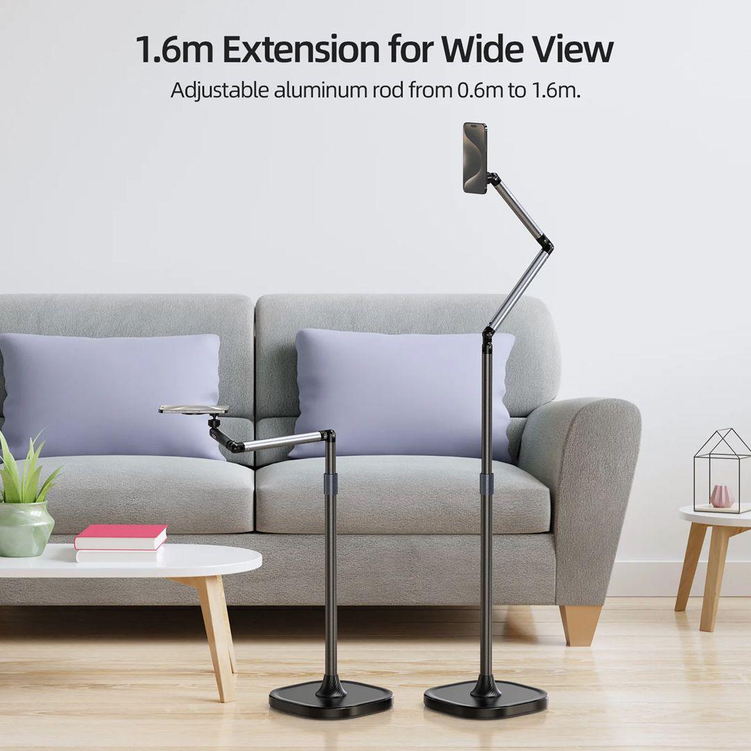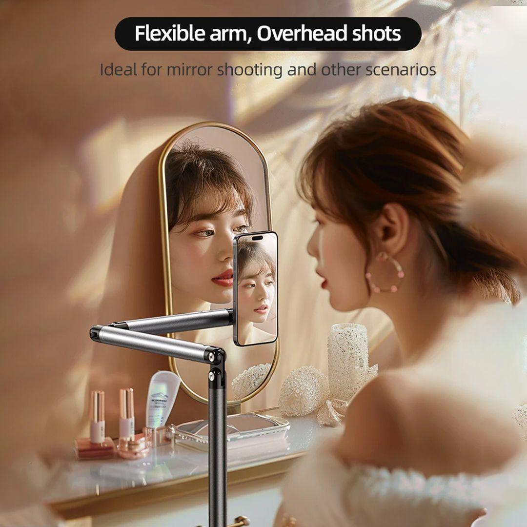 Aluminum telescopic arm extends from 0.6 m to 1.6 m, perfect for standing shots, desk streaming, cooking videos, distance framing, and more.