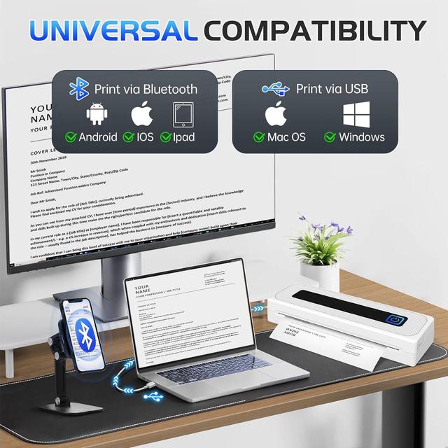 This printer connects to computers and smartphones (Android + iOS) via Bluetooth.