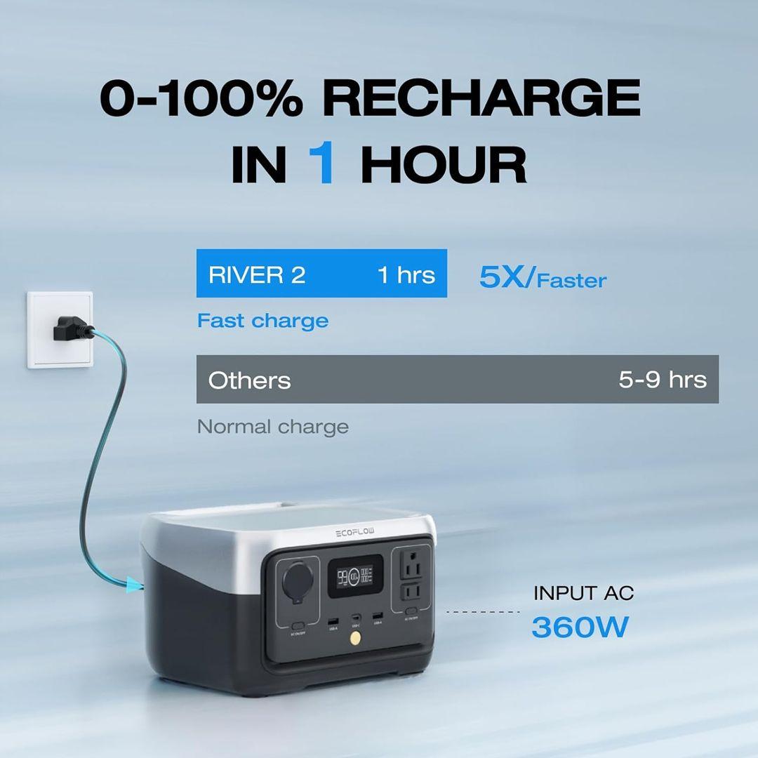 Be ready for any emergency in minutes! The EcoFlow River 2 fully charges in just 1 hour, 5x faster than most other portable power stations. Whether you’re preparing for a spontaneous trip or need urgent power during an outage, you’ll always be ready without long waiting times.