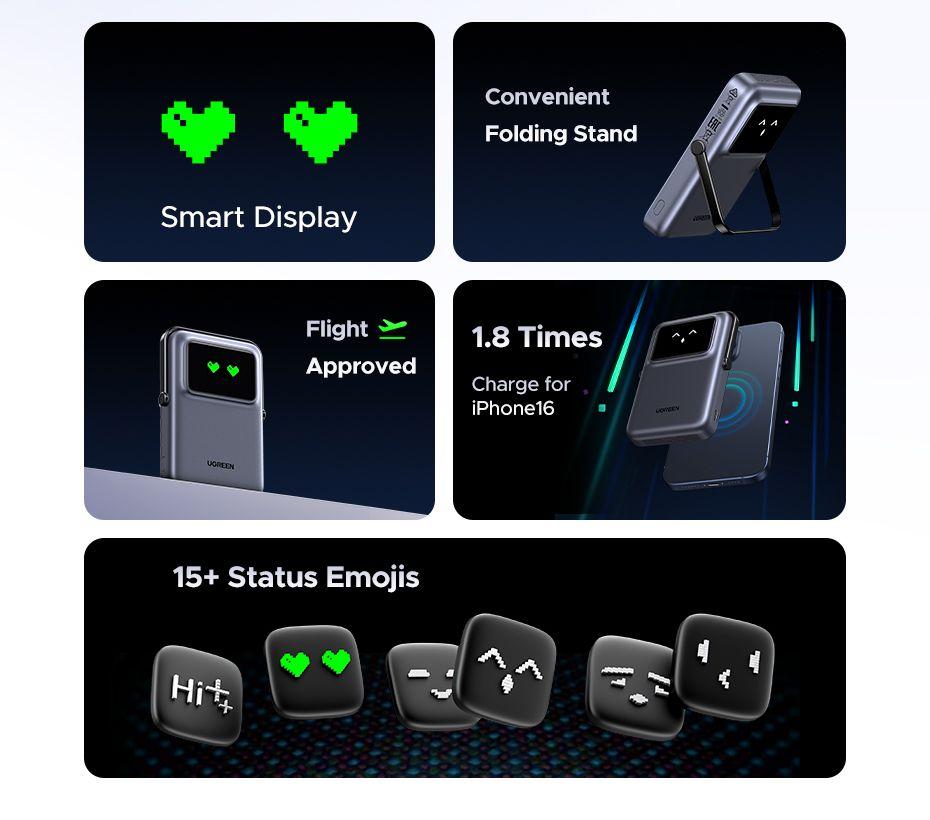 TFT Fun Display: Ugreen magnetic power bank has a bright TFT display that reflects the battery power through expressions, so the power status is clear at a glance, while adding fun to your charging experience