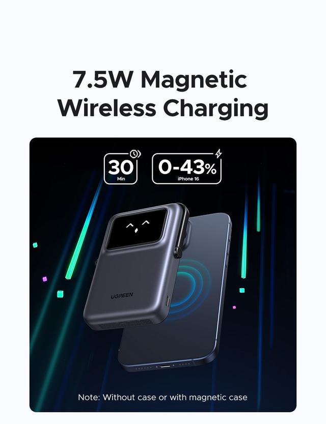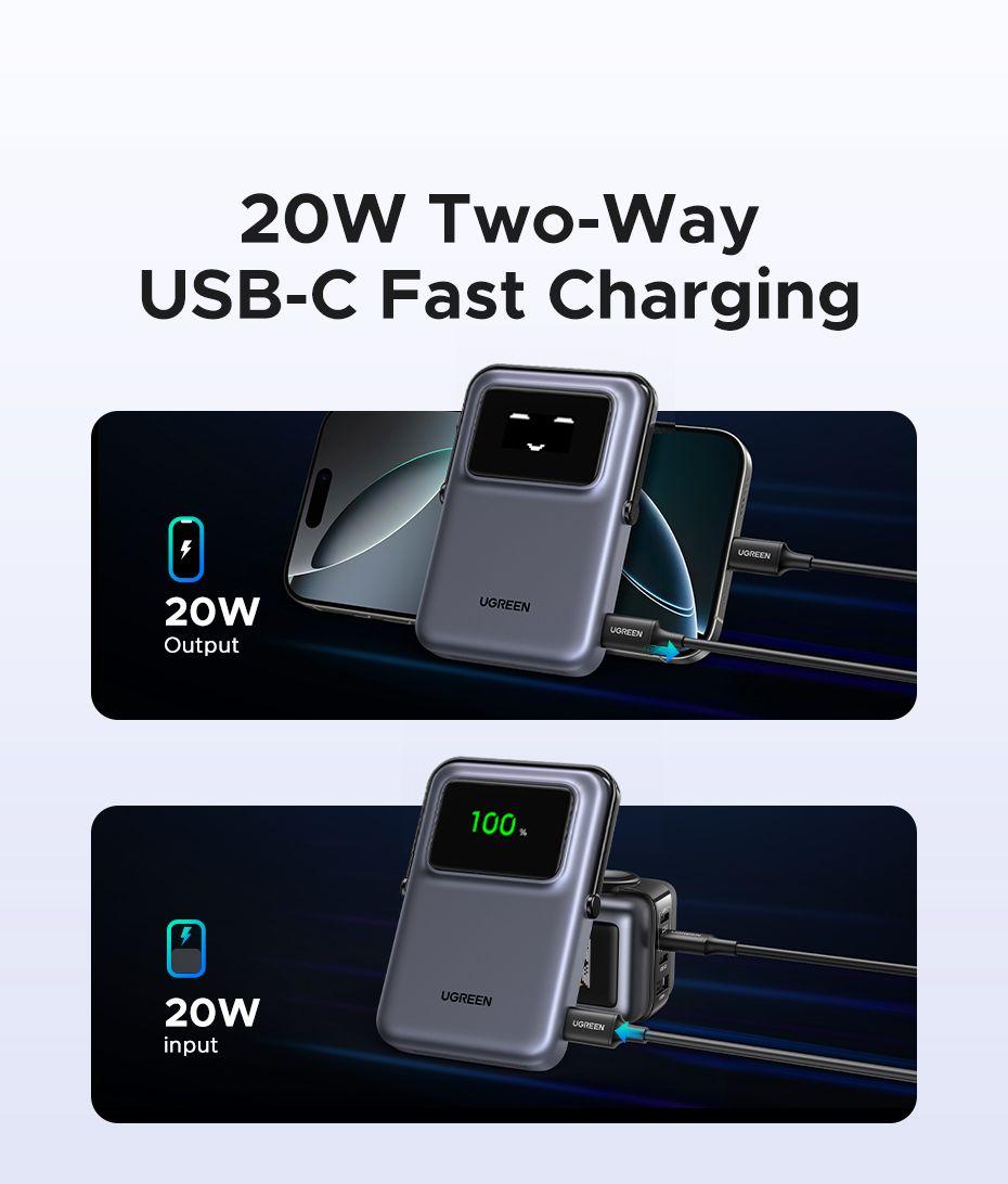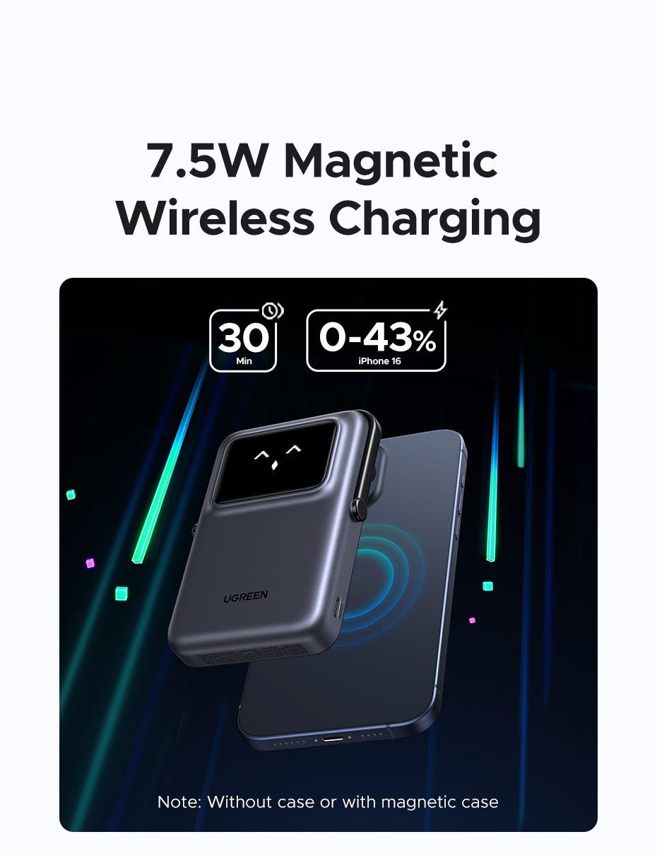 Wireless and Wired Charging: Ugreen battery bank offers 7.5W magnetic charging, while also supporting PD 20W wired charging. It combines convenience and power to ensure you can power two devices at the same time