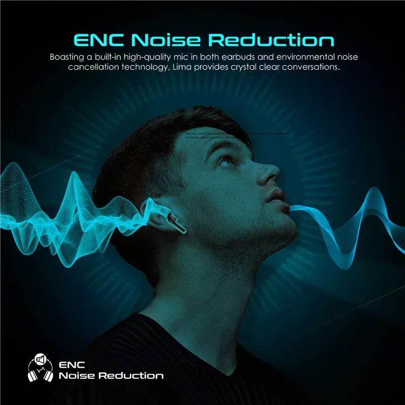Set out on a magical musical journey with Lima. These True Wireless Stereo earbuds, outfitted with Bluetooth v5.3 and IntelliTouch controls give you an unmatched, hands-free audio experience. Built-in ENC microphones, amplify your voice, providing a crystal-clear calling and listening experience. Enjoy your music for up to 7 hours per charge and up to 30 hours with the 300mAh charging case. The charging case comes with a protective Silicone case and fits easily in your pocket and bag while preventing scratches, while the additional earbud holding strap provides steady placement. Revel in music and enjoy wireless freedom with Lima.