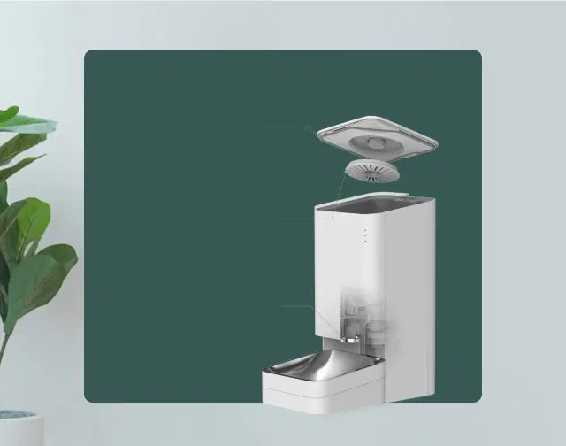 Keeps food fresh and hygienic → Food‑grade stainless steel bowl, 360° silicone seal, and replaceable desiccant cartridge.