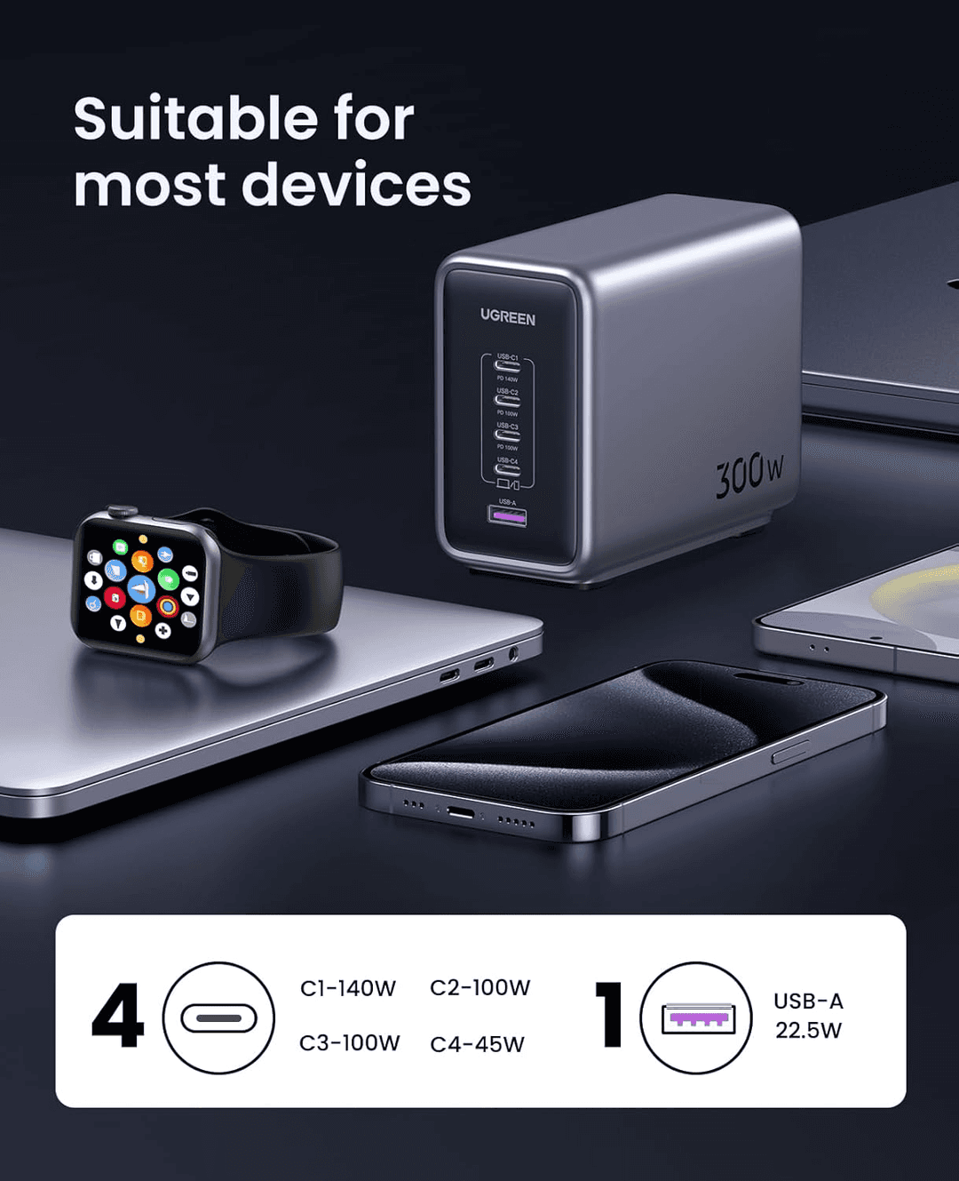 5 Ports, More Choice : Take your work efficiency to the next level. UGREEN Nexode 300W USB C charger supplies 5 devices at same time like 1 × MacBook Pro, 1 × Lenovo ThinkPad E15, 1 × iPhone 15 Pro Max, 1 × Samsung Z Fold5, and 1 × iPad Pro or AirPods or iWatch.