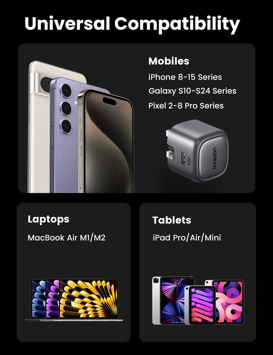 High Compatibility: This USB C plug has high compatibility, UGREEN phone charger compatible with iPhone 8-17 Series, Galaxy S10-S25 Series, Switch, AirPods, Watch and many other devices.