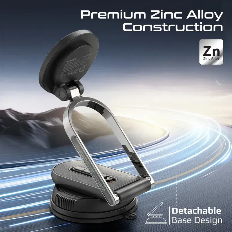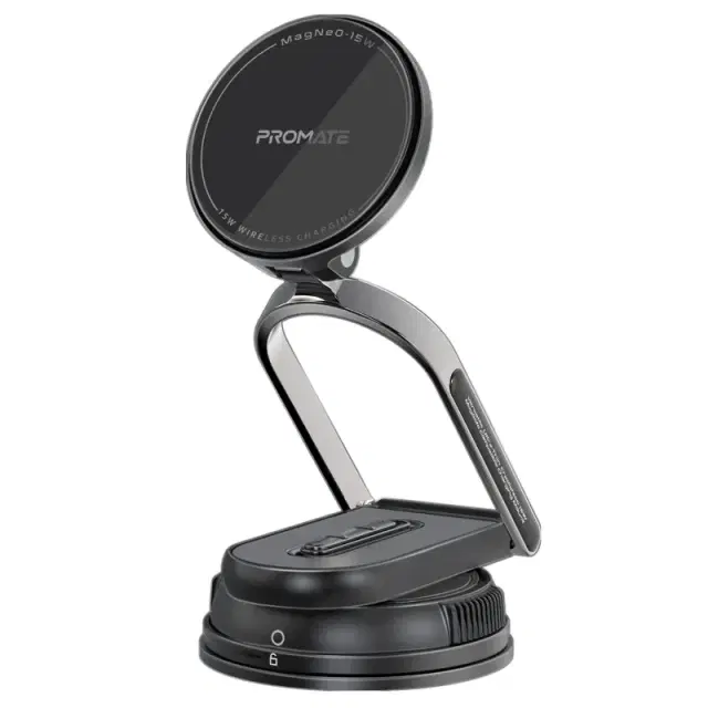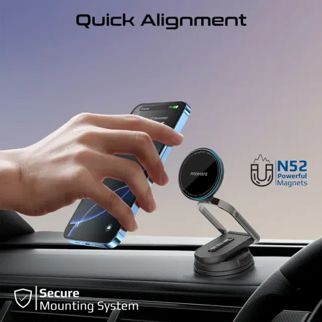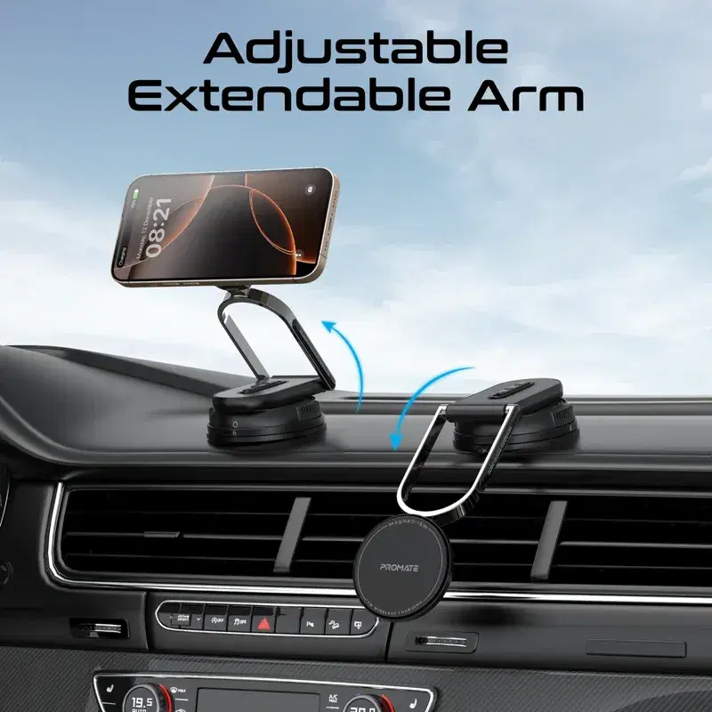 Revolutionize the way you charge on the go with Promate’s MagNeo-15W. This wireless phone charging mount combines sleek design and cutting-edge technology for a seamless experience. Delivering 15W MagSafe-compatible charging, it ensures your devices are always powered up with speed and efficiency. The adjustable extendable arm and detachable body with a secure lock mechanism, offer unmatched versatility, making it perfect for both Windshields and dashboards. Built with durable zinc alloy and a cradleless 360° rotatable base, it provides optimal viewing angles while keeping your device securely in place. Quick alignment and a multi-safety system, including Foreign Object Detection (FOD), ensure effortless and safe charging on the road.