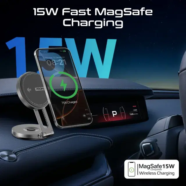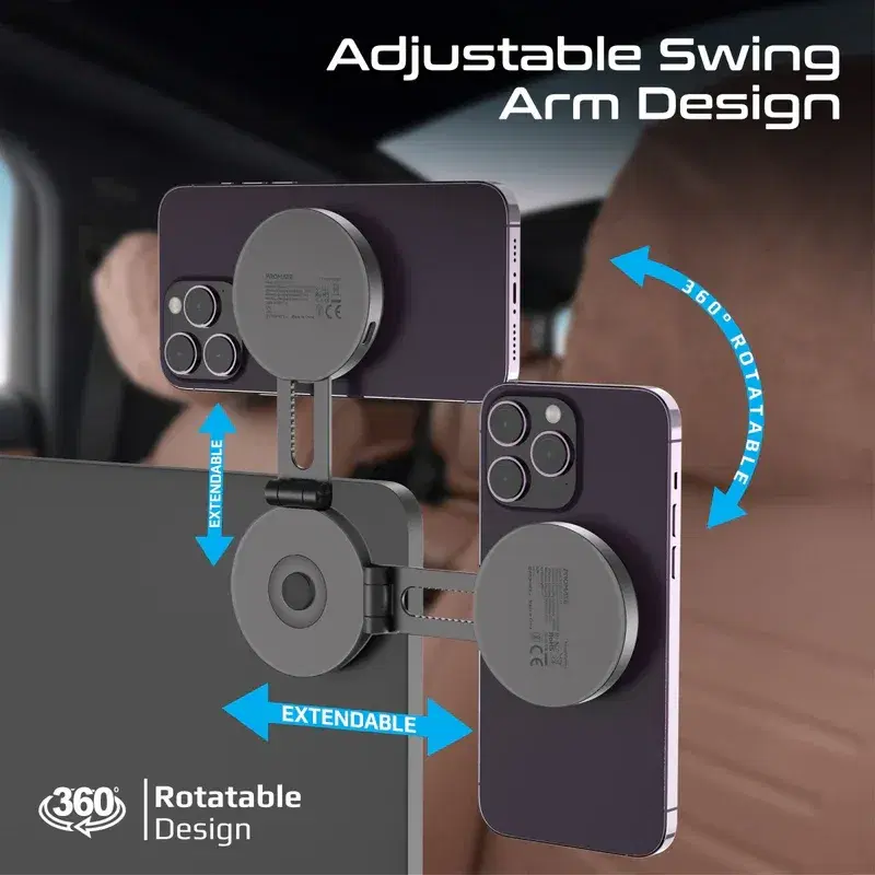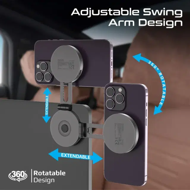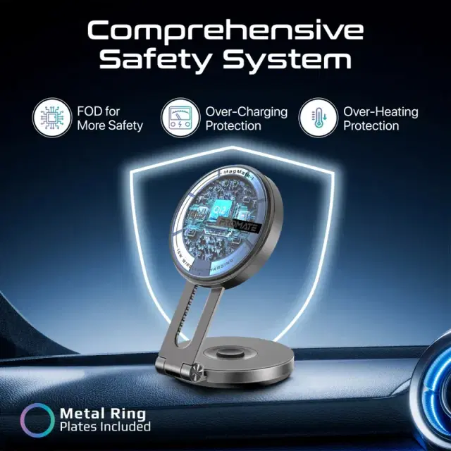 Enhance your setup with the Promate MagMate-1, where cutting-edge technology meets sophisticated design. This Qi2-certified magnetic phone charging mount provides 15W MagSafe-compatible charging while ensuring secure and precise alignment. Engineered for dashboards and LCD screens, its rotatable and extendable swing arm offers effortless adjustability and optimal viewing angles. The cradleless 360° rotatable design combines convenience with accessibility, while the durable metal alloy construction ensures reliability. Equipped with a multi-safety system and foreign object detection, the MagMate-1 prioritizes safety and efficiency. Complete with a metal ring adapter for universal compatibility, it sets a new standard for in-car charging solutions.