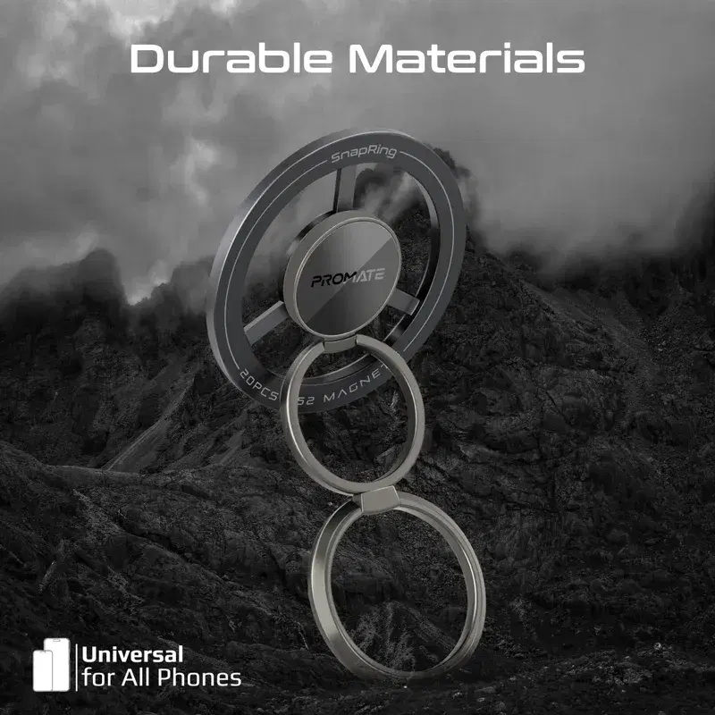 Elevate your smartphone experience with Promate’s SnapRing, a versatile, magnetic double ring phone holder designed for ultimate versatility and convenience. Engineered with MagSafe compatibility, this sleek, foldable holder snaps on to your device and then effortlessly transitions between being a horizontal or vertical stand, providing multi-angle 360° free rotation for unparalleled viewing flexibility. The adjustable dual axes and foldable design ensure compact portability, while the satisfying rotation clicking sound is an audible and tactile delight. Featuring a mirror surface center and crafted from durable materials, SnapRing merges style with functionality, making it the perfect companion for any mobile lifestyle.