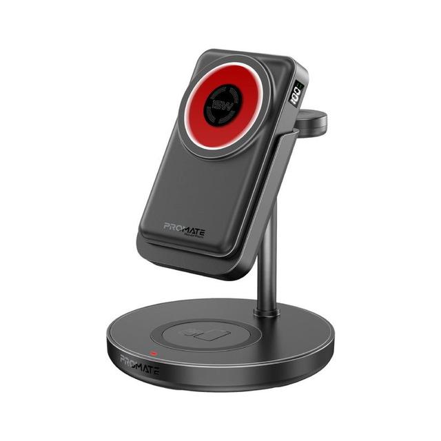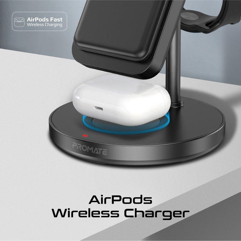 4-in-1 charging station integrating phone wireless charger, watch module, earbuds pad and detachable power bank.