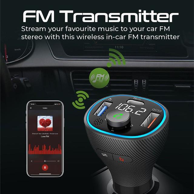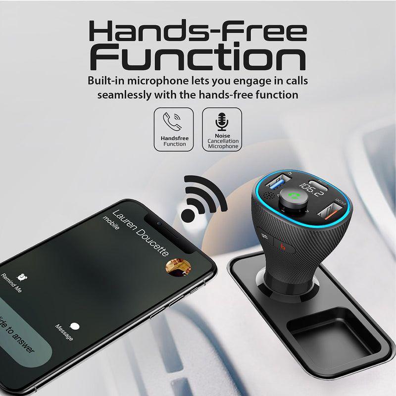 FM transmitter covering 87.5‑108.0 MHz so you can play phone audio through your car stereo.