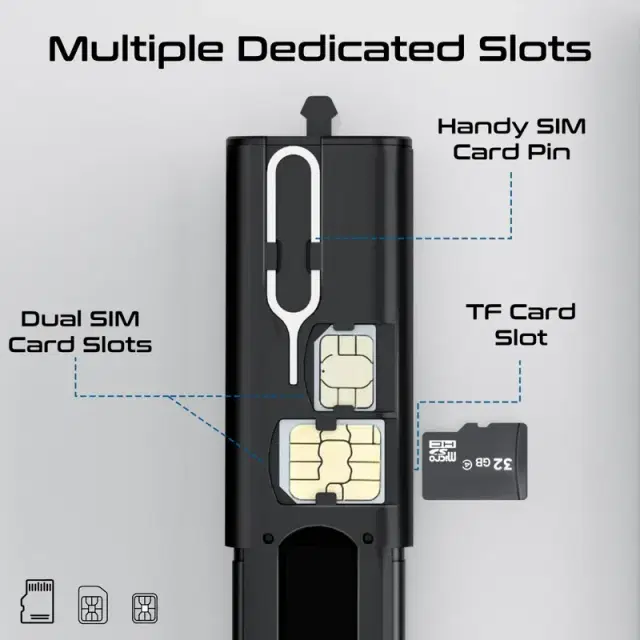 PERK by Promate is the ultimate travel companion for tech-savvy adventurers and busy professionals alike. This sleek, compact rectangular pusher case is a convenient all-in-one solution for your smartphone on the go, housing a powerful, 60W fast charge and sync USB-C cable, alongside versatile adapters for Micro-USB, Lightning and USB-A connections. PERK also features TF card slots, Micro and Nano SIM card slots, and a handy SIM card pin, ensuring you're prepared for any digital task on the go. Lightweight and easy to carry, PERK seamlessly blends style and functionality, making it the must-have gadget for efficient and hassle-free travel. Empower your journey with PERK and stay connected, wherever you are.