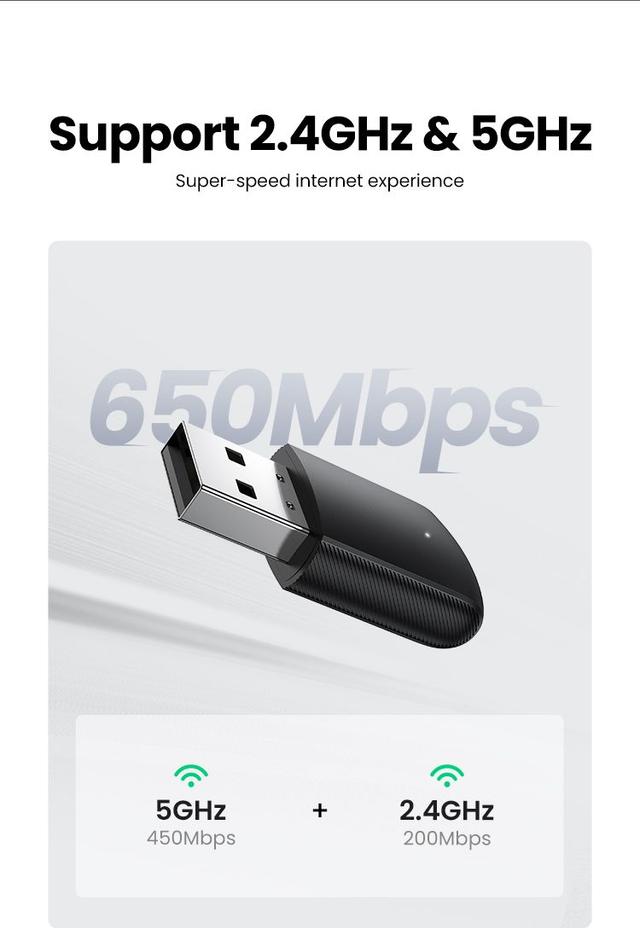Extremely High Speed: UGREEN AC650 USB Wireless Network Adapter up to 433Mbps in 5.0GHz band, and up to 200Mbps in 2.4GHz band. Whether you are online gaming, surf the Internet, online HD video streaming, upload, or download, it can perfectly meet your needs.