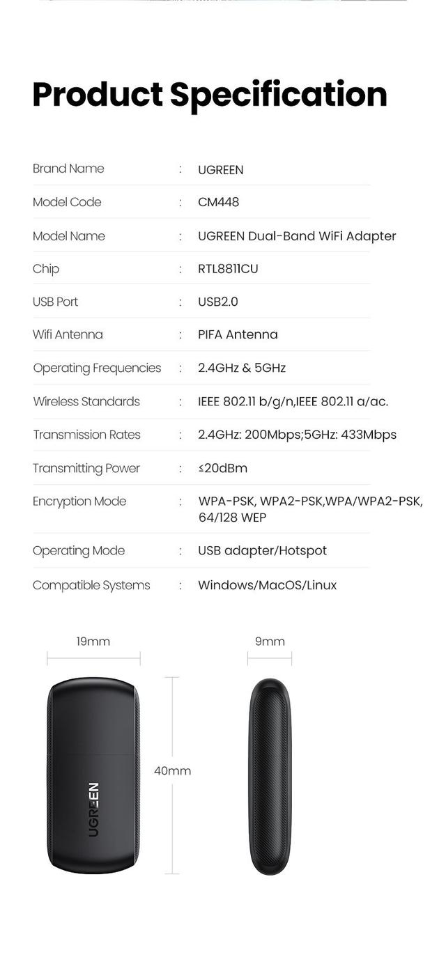 Compact Mini Size: UGREEN PC Wifi Adapter has a mini size of 40 x 19 x 9 mm. You can easily carry it in your office bag or pocket. When plugged into a computer or laptop, it is also inconspicuous. So it's definitely an excellent choice to extend wifi for your device.