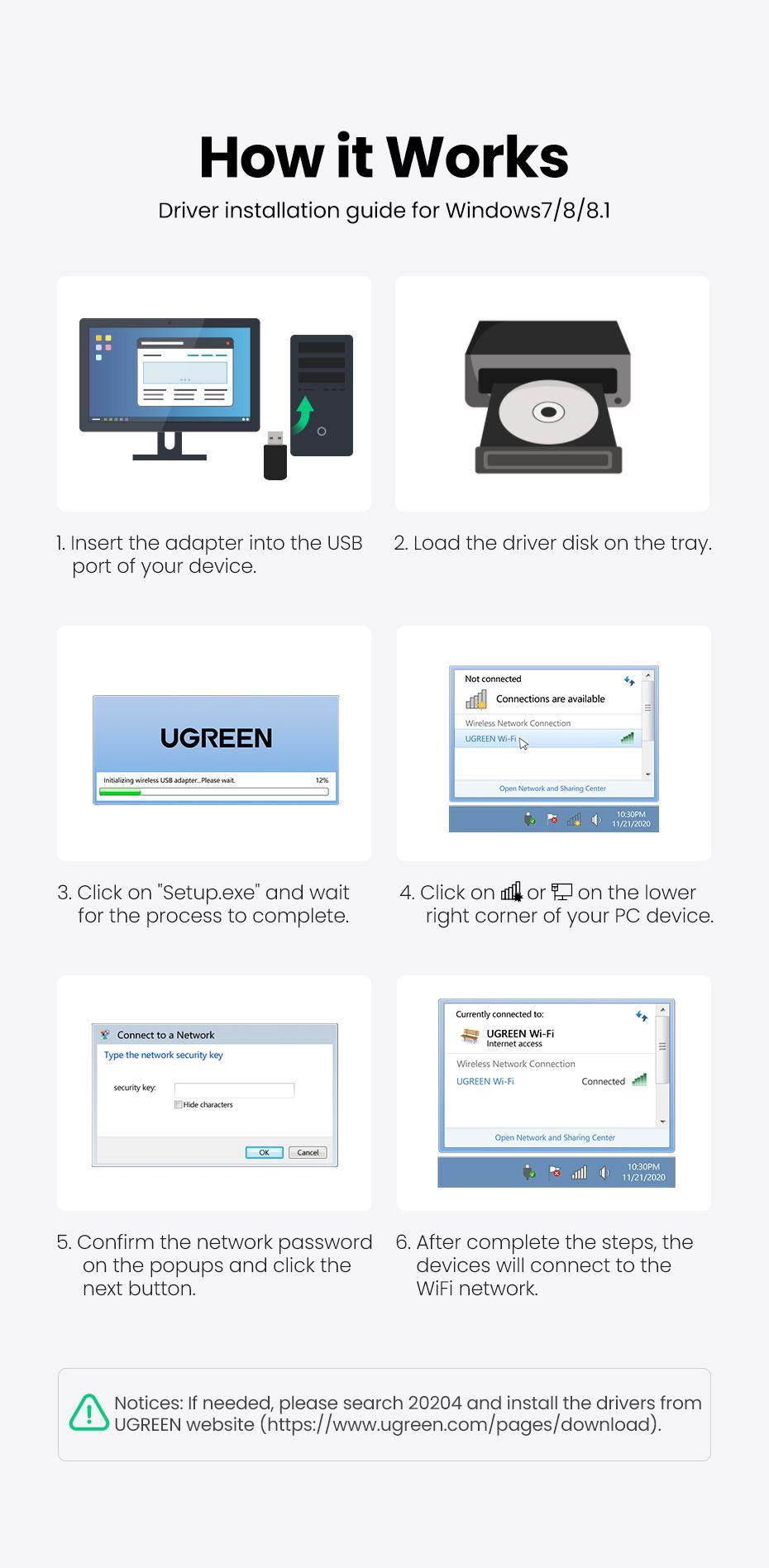 Widely Compatible: UGREEN USB wifi adapter can support Windows 11/10/8.1/8/7. which can easily install the driver through our instructions.