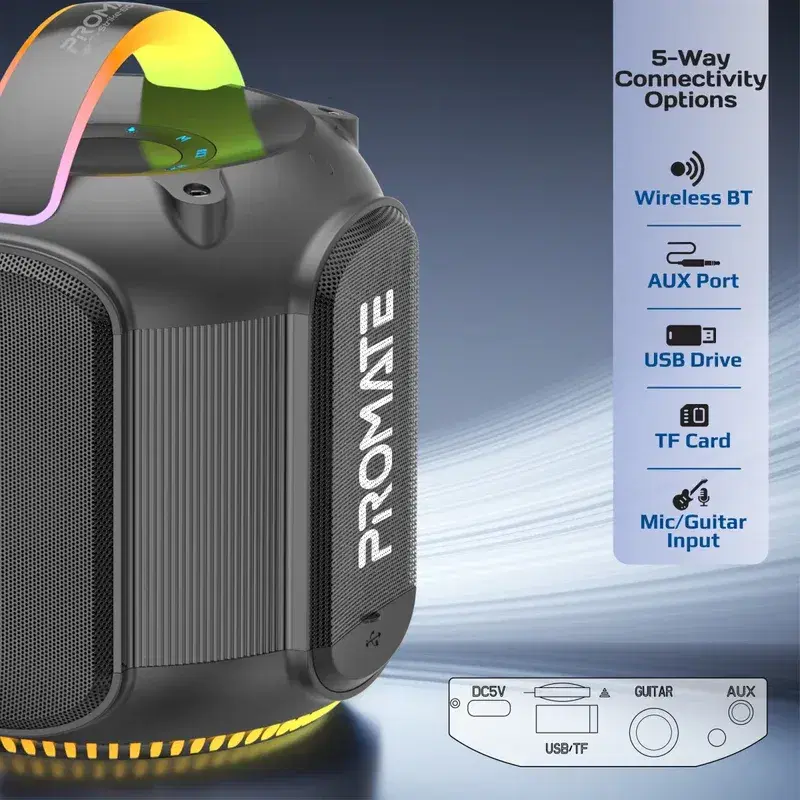 Strike-80 by Promate brings immersive sound and stunning visuals together in one dynamic speaker. Delivering 80W of stereo sound, this high-fidelity TWS-compatible speaker offers an exceptional listening experience. With 6 hours of playtime and a 3600mAh lithium-ion battery, it keeps the music going longer, while the 12 hours of standby time ensures it's always ready. Enjoy versatile connectivity with five audio playback options, including TF card, USB drive, AUX, and even a 1 / 4” guitar port for jamming along to your favourite tunes! The vibrant RGB lights set the mood with five dynamic modes, while the built-in handle with RGB lights adds a touch of style and portability. IPX5 water resistance makes it perfect for outdoor adventures, and quick music navigation keeps you in control. Strike-80 combines function, design, and performance in one powerhouse speaker.