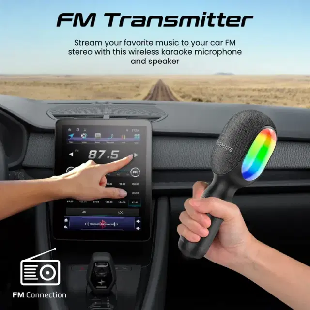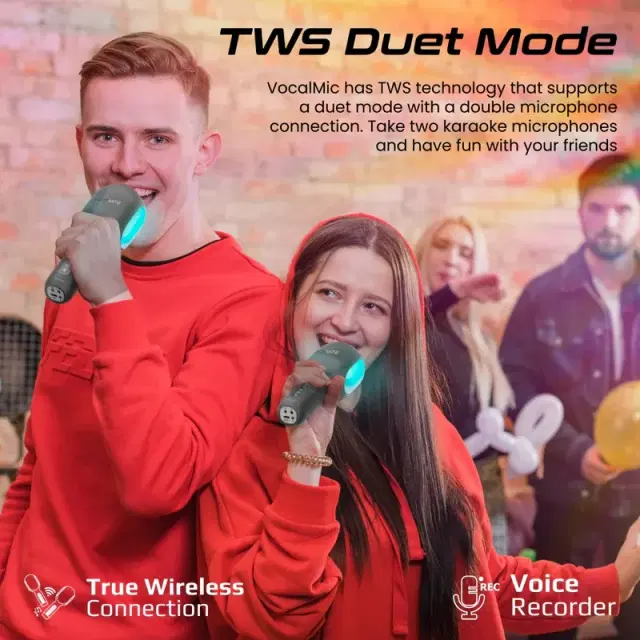 Whether you're a pro or a novice, karaoke is for everyone and VocalMic is the ideal party starter. This 5-in-1 karaoke microphone uses the latest Bluetooth v5.0 technology to provide a more stable connection and the TWS duet mode allows you to take two karaoke microphones and have fun with your friends. You can also stream your favorite music to your car FM stereo, connect to the 3.5mm AUX port and connect to headphones with this multifunctional karaoke microphone and speaker. Choose from 4 stunning dynamic RGB lighting effects and light up the party. Go bold with karaoke – try new tunes and let your voice shine with VocalMic.