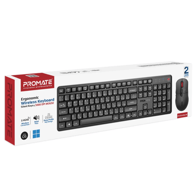 Paired with a high-precision 6-button mouse, the ProCombo-15 offers adjustable DPI settings from 1000 to an incredible 5000 DPI, allowing you to switch between precision editing and rapid navigation instantly. Both devices operate on a 2.4GHz wireless frequency, ensuring stable connectivity within a 10-meter range. Compatible with Windows, macOS, and Android systems, this combo is ideal for multitaskers, professionals, and everyday users. Powered by a single AA battery each and built with durable ABS plastic, it delivers effortless mobility and long-lasting performance.