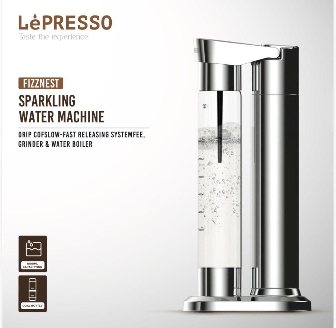 The Lepresso Fizznest Sparkling Water Machine presents a sleek finish and also ensures durability while making a refreshing glass of sparkling water at home. Having a large 1000mL bottle capacity with two other bottle size options (500mL and 350mL), it guarantees the hydration needs of any occasion. Its 800mL sparkling water capacity is great for family use and entertaining. The product is made from top-grade Stainless Steel 304 for durability and long service life. Compatible with CO2 chargers for easy carbonation while featuring dual bottle designs made of explosion-proof PET and BPA-free materials for safety considerations. The machine is easy to use and easy to clean. It also has a 2-step (slow and fast) releasing system that gives you full control of the carbonation process. Whether you are making a fizzy drink for yourself or your guests, the Lepresso Fizznest spells convenience and quality with every use.
