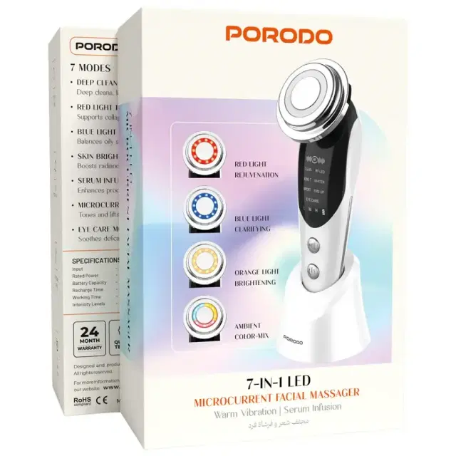 The Porodo 7-In-1 Microcurrent Facial Massager - White is a total skin care answer, offering an array of sophisticated functions all packed in a chic, easy-to-carry design. The 650mAh battery makes it possible for the device to work continuously for 70 minutes after 3 hours of charging through the USB-C port. This gadget features a customer-oriented setup with 3 different levels of intensity and a vibration with a frequency of 10,000 RPM. The skin care process consists of several steps; the EMS microcurrent lift and warm massaging therapy are the first ones to make the skin look young and fresh. After that, gentle eye treatment and deep cleansing modes come in to take care of the most sensitive areas, and in the process, the pores get deeply cleaned. The massager is equipped with LED light treatments that have red, blue, orange, and color-mix options for effective skin therapy that includes skin brightening and serum penetration. The device can be used for red light therapy to stimulate collagen production or blue light therapy for acne breakouts, and it is totally comfortable to use while doing skin care.