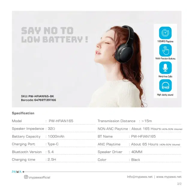 Ultra-long battery life: up to 165 hours without ANC and 65 hours with ANC.