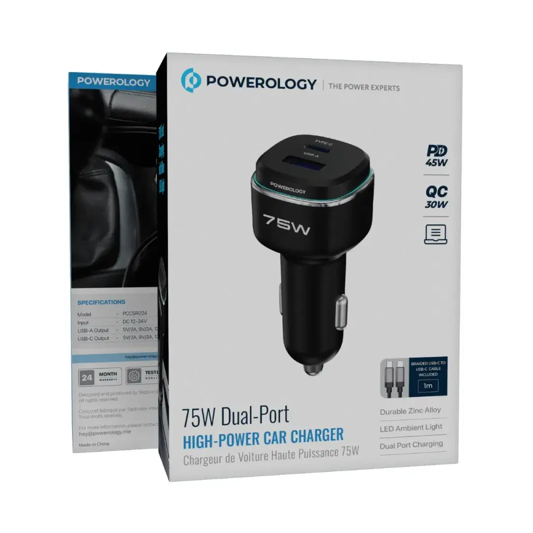 Powerology 75W Car Charger PCCSR024BKGYC Powerful and Sleek in One Device