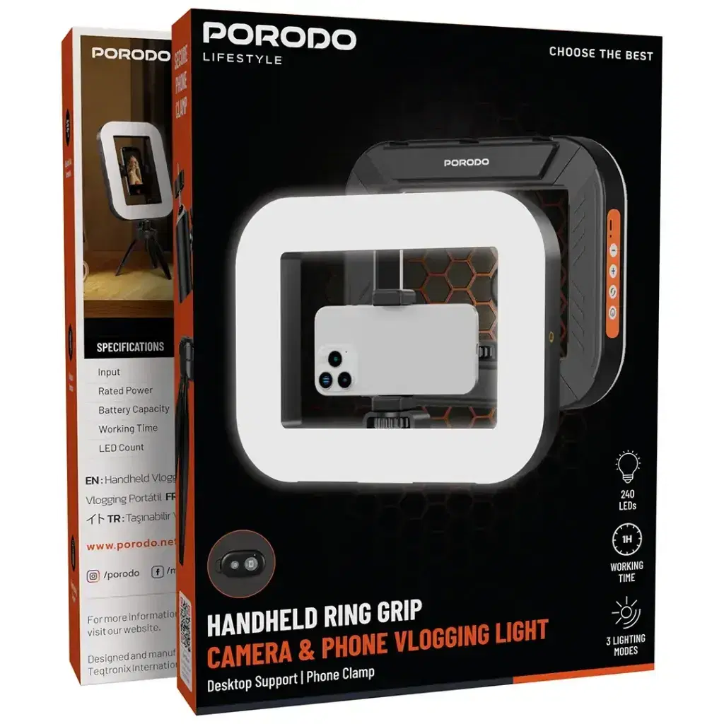 Porodo Lifestyle Handheld Ring Grip Camera & phone vlogging light with Desktop support & Phone clamp - PDLFST214BK
