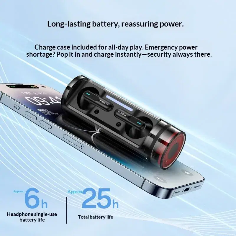Long-lasting playtime for uninterrupted entertainment. Each earbud provides up to 6 hours of use per charge, while the full charging case ensures a total usage time of up to 25 hours, keeping you connected all day long.