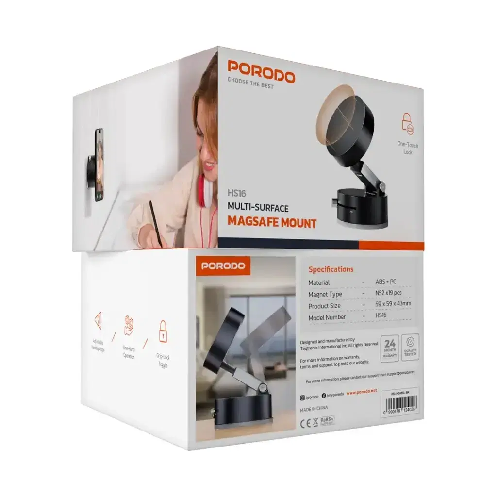Porodo Multi-Surface MagSafe Mount in black is a unique and secure solution for any mobile device mount. Constructed with ABS + PC materials, the mount is embedded with 19 N52 magnets, providing a strong and stable hold. The One-Touch Lock allows you to mount your device in seconds, while the adjustable viewing angle allows for comfortable hands-free use. Easy enough to set up with one hand. The Grip-Lock Toggle solidifies the mount to keep your device from slipping off when used in different locations. It combines utility and an elegant surface design for cars, desks, or smooth surfaces.