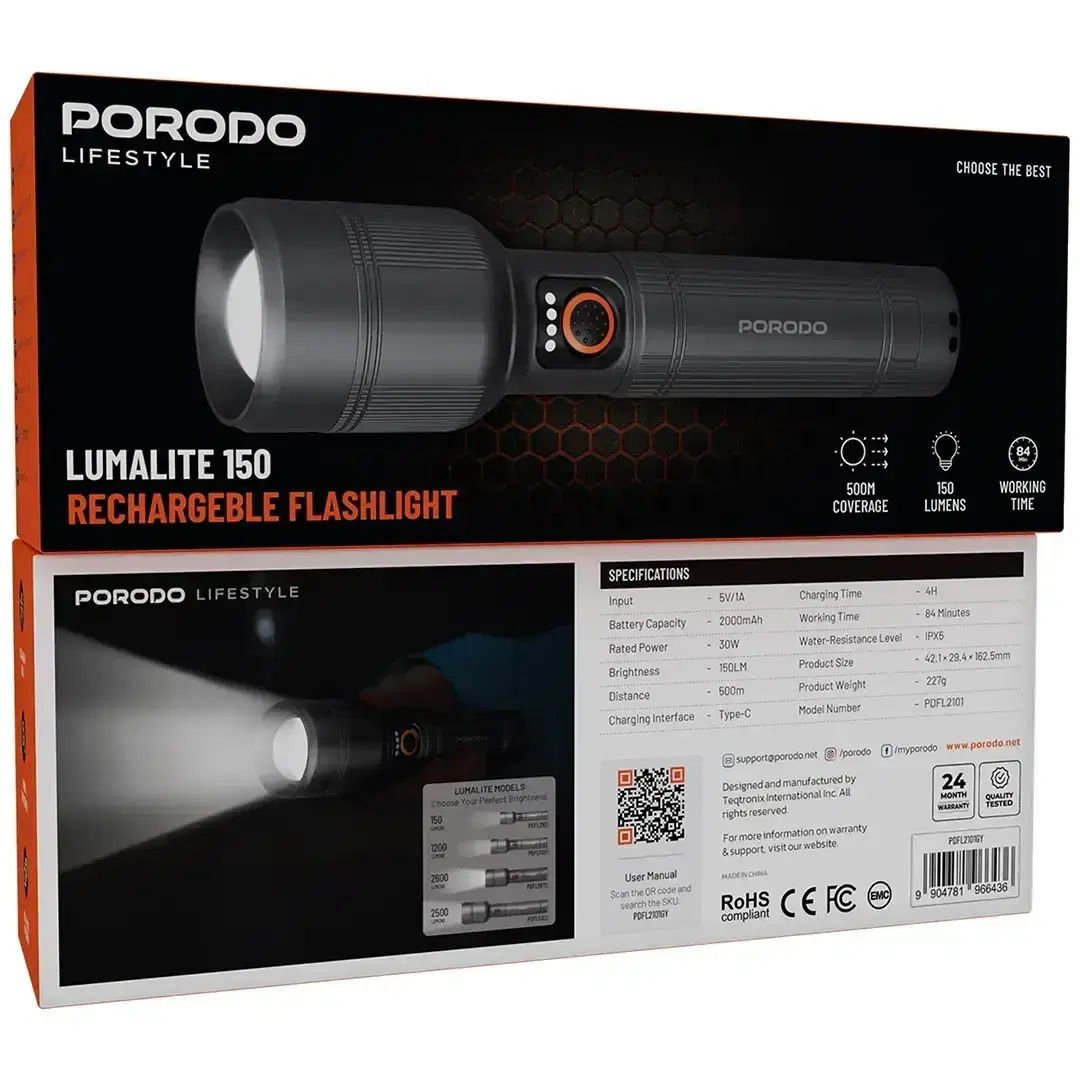 Porodo PDFL2101GY Lumalite 150 – Powerful Rechargeable Flashlight