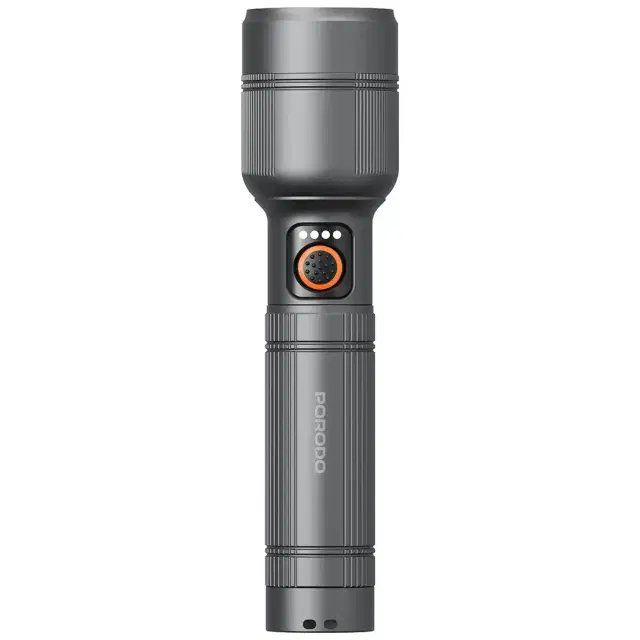 The Porodo Lifestyle rechargeable flashlight in gray is a must-have accessory that ensures excellent and reliable illumination in any situation. With a powerful 2200mAh battery and an impressive 1200-lumen output, this flashlight has a beam that can reach up to 500 meters. It features a Type-C charging port, allowing for a full charge in just 4 hours with 84 minutes of usable use. The flashlight also boasts a manually adjustable high-intensity beam setting, from illuminating a large area to spotting a distant object. The Porodo Lifestyle flashlight also offers multi-mode operation, making it easy to switch between different brightness settings, whether outdoors, at work, or in emergencies. It has an IPX5 rating, meaning it will withstand splashes and even rain, so its durability is undeniable. The Porodo Lifestyle flashlight is not only reliable but is also, in fact, one of the best-performing portable flashlights available; therefore, it is suitable for camping, hiking, and everyday use.