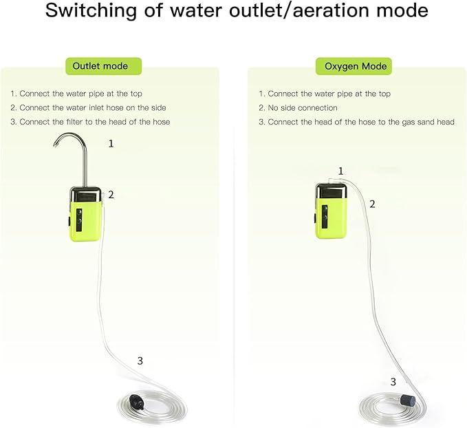 This sensing water pumping oxygen pump has smart, lighting and aeration mode. You can use it for drinking water from bottle when you are in outdoor, also can be used for aquarium oxygenation.