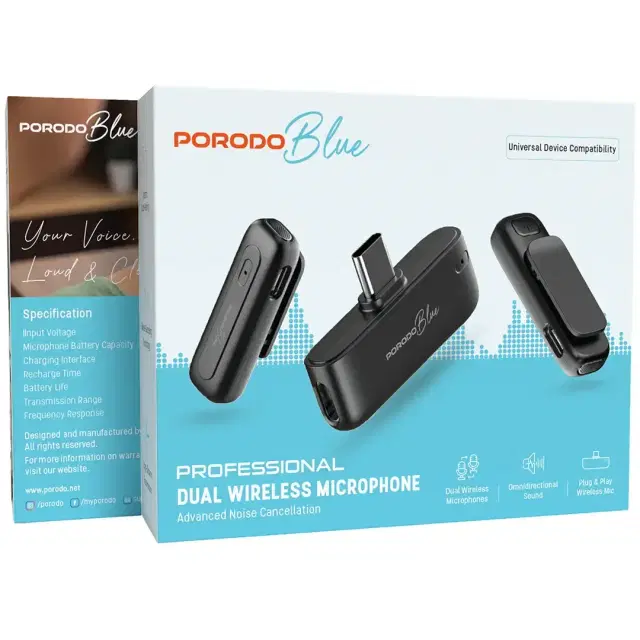 The Porodo Blue Wireless Microphone - Black is a fantastic gadget for those who desire portable, clear, and high-quality audio. This device, employing noise-cancelling technology, produces a clear sound that is perfect for interviews, videotaping, and presentations. Furthermore, it has a feature that warns you automatically to indicate the device's status; therefore, you will not miss any significant time. On top of that, it keeps working well for about 8 hours after a single charge, so you will be able to focus on your content without the need to worry about power. The wireless system not only is a great convenience for the user but also offers pairing within a range of 10m, which allows a great degree of movement. Besides, the USB-C port supports quick charging, and the compactness of the microphone makes it very convenient to have it with you wherever you go. Porodo Blue Wireless Microphone - Black is the one that delivers industry-standard audio quality, and you can either have it recorded on your smartphone, camera, or computer.