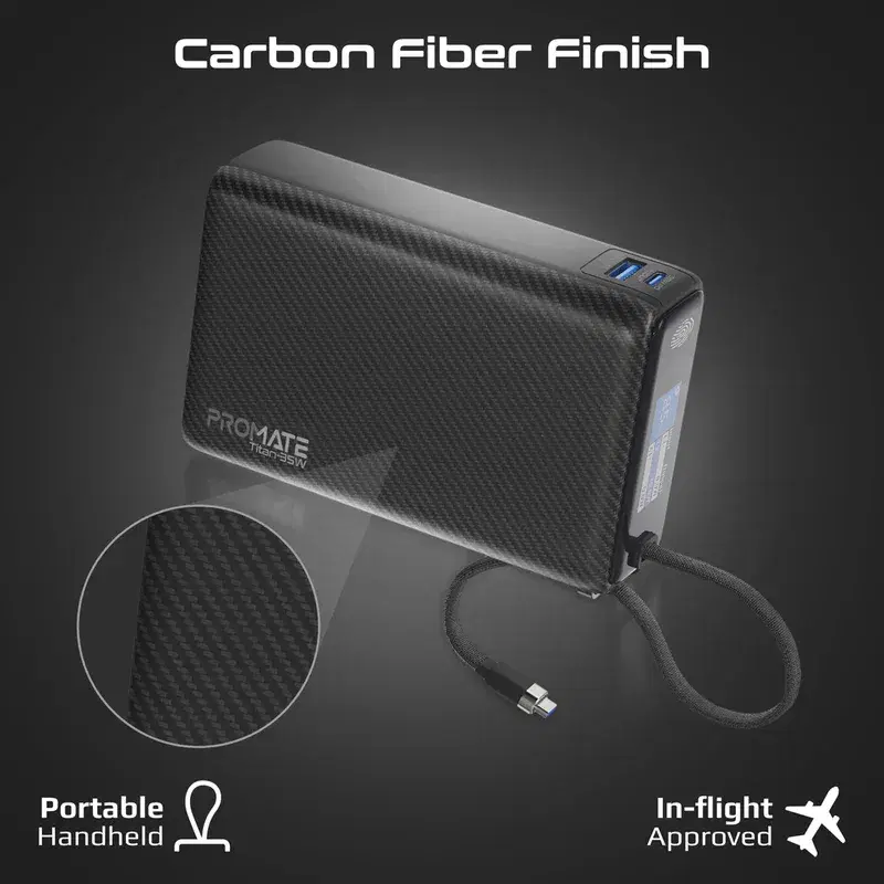 The smart TFT LCD screen provides accurate real-time readings of power levels and individual output status, giving you full control over your charging. Built with fireproof ABS and PC materials finished in a sleek carbon fibre texture, the design combines durability with modern aesthetics. Compact and lightweight at only 368g, Titan-35W fits easily in any bag while providing robust power protection against overcharging, overheating, and over-discharging. Perfect for professionals, travelers, and power users, Titan-35W redefines portable charging with speed, intelligence, and reliability.