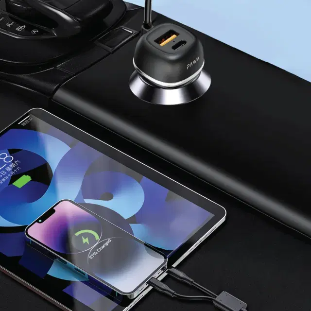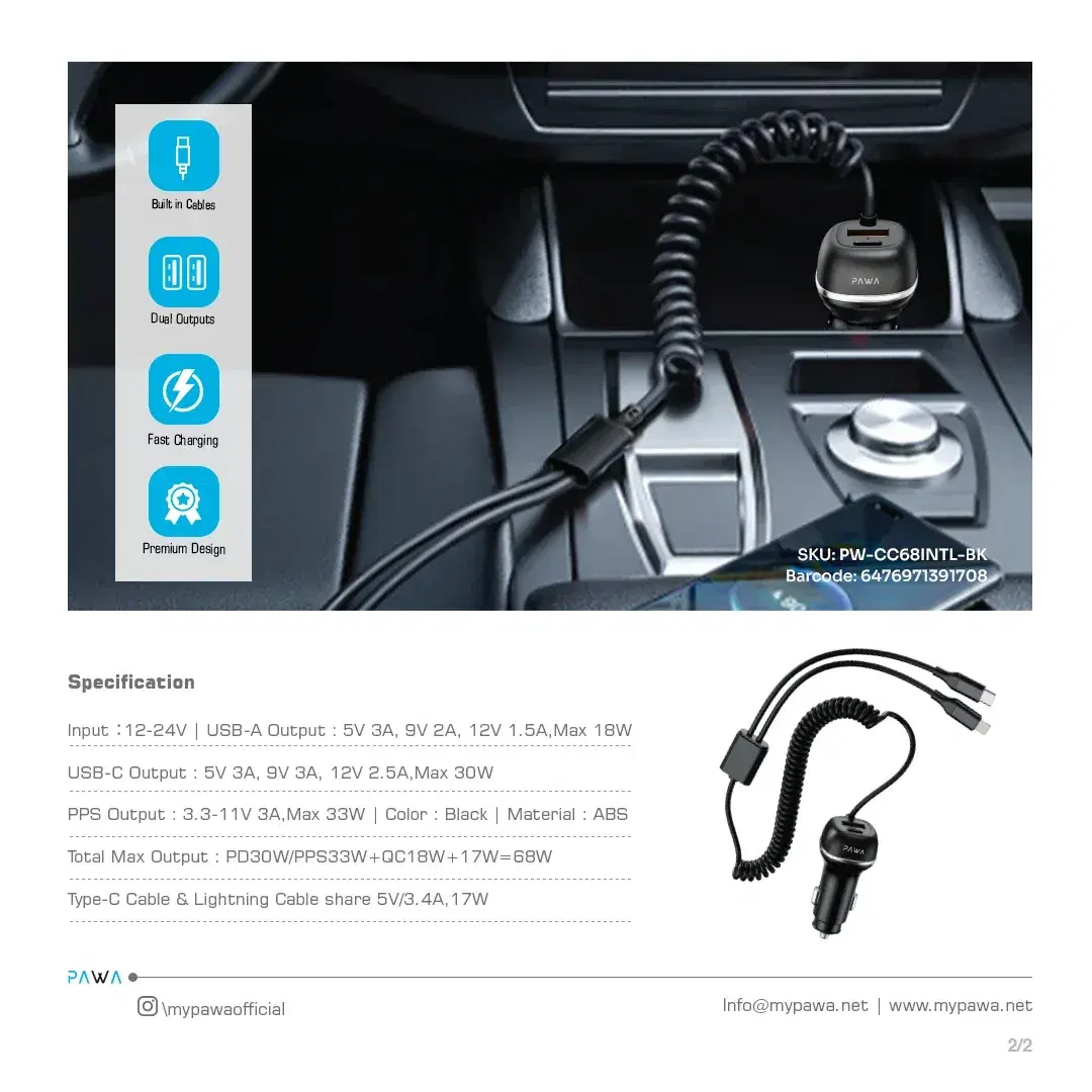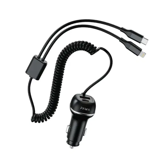 Pawa PW-CC68INTT-BK Solid Car Charger Dual Port Pd+Qc With Usb-C And Lightning Built-In Cable 68W