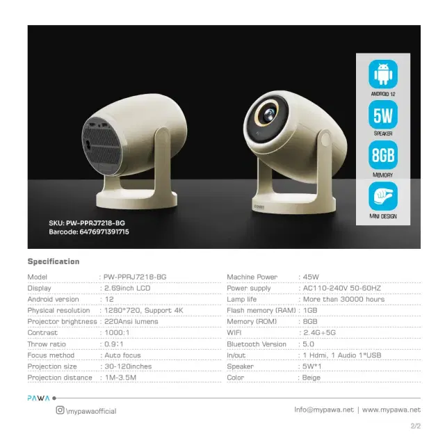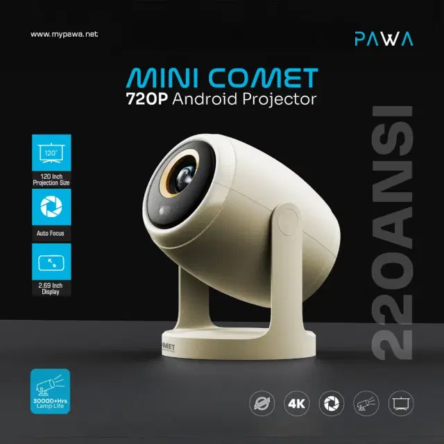 Pawa PW-PPRJ7218-BG Mini Comet Android Projector with 220ANSI Lumens