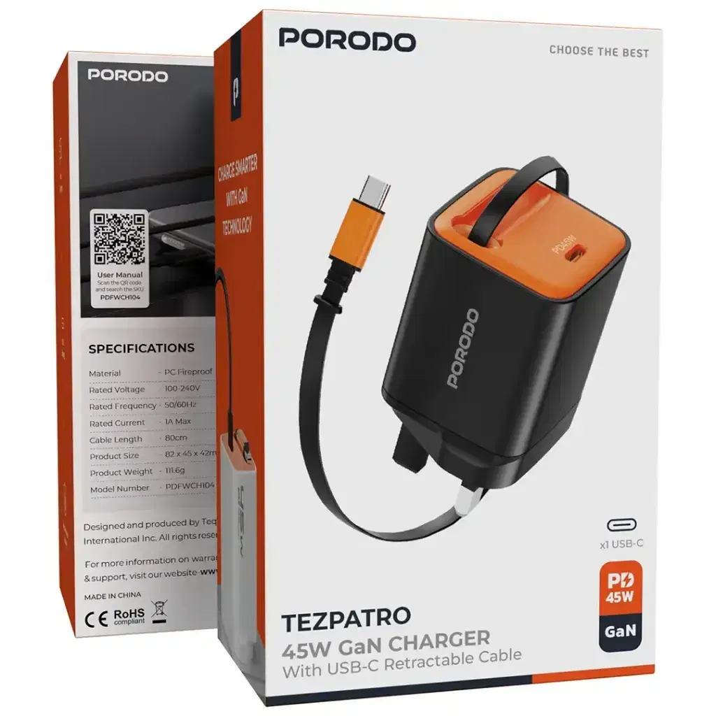 Porodo PDFWCH104 Tezpatro 45W GaN Charger with USB-C Retractable Cable