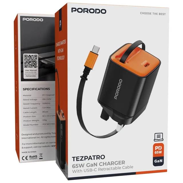 Porodo Tezpatro 65W GaN Charger with USB-C Retractable Cable