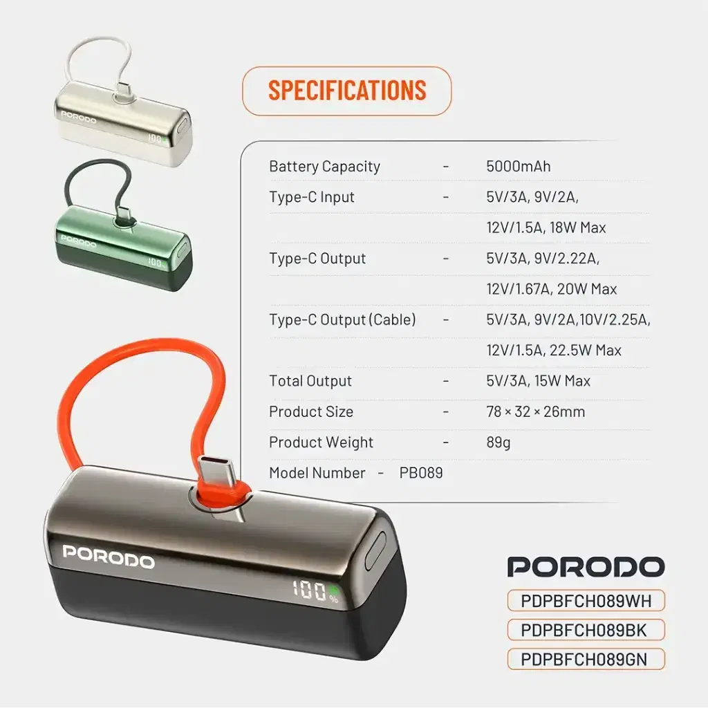 The Porodo Pocket Volt is a high-charging product that is compact and portable. It carries the conflicting reputation of being a power bank with a capacity of 5000mAh. This power bank allows fast charging with a Type-C input/output of 5V/3A, 9V/2.22A, and 12V/1.67A; max 20W output. This Type-C cable adds some charging versatility and supports up to 22.5W max-fast charging, good enough to quickly charge smartphones and tablets. It has a 15W max total output, capable of charging various devices simultaneously. The Porodo Pocket Volt Power Bank is so compact and thin that it will probably fit perfectly into your bag or even into your pocket. That makes it just right for travel or for carrying around during the day. The Porodo Pocket Volt Power Bank with PD 22.5W helps you stay fully charged in those critical moments when you can't afford to run out of power.