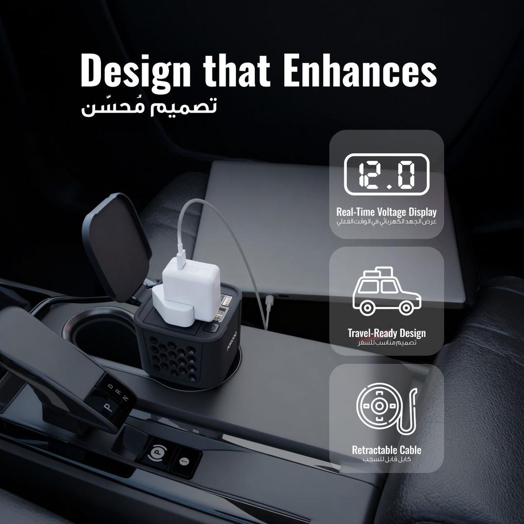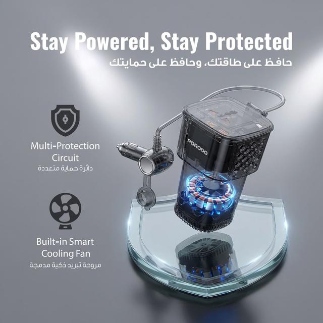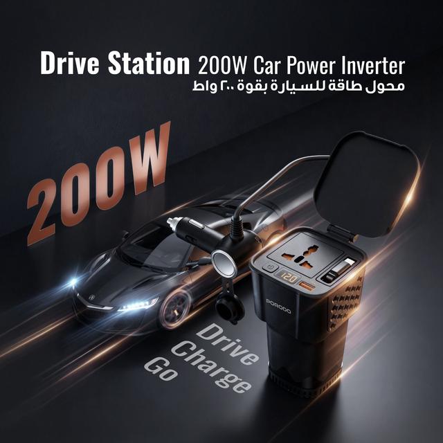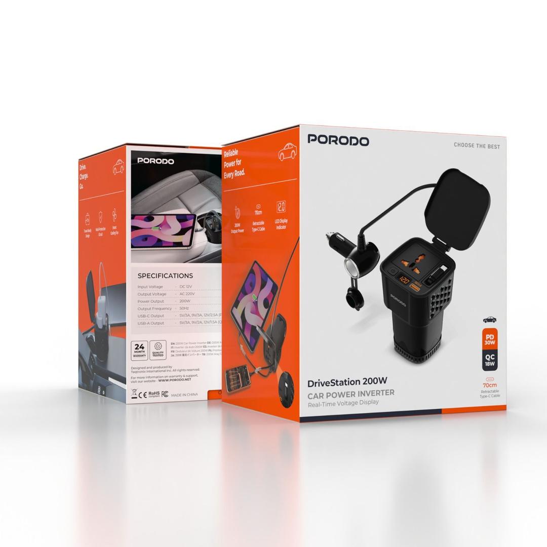 Porodo PDCI103BK DriveStation 200W Car Power Inverter with Real-Time Voltage Display
