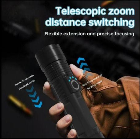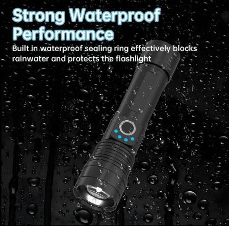 Features multiple lighting modes including high, medium, low, strobe, and SOS.